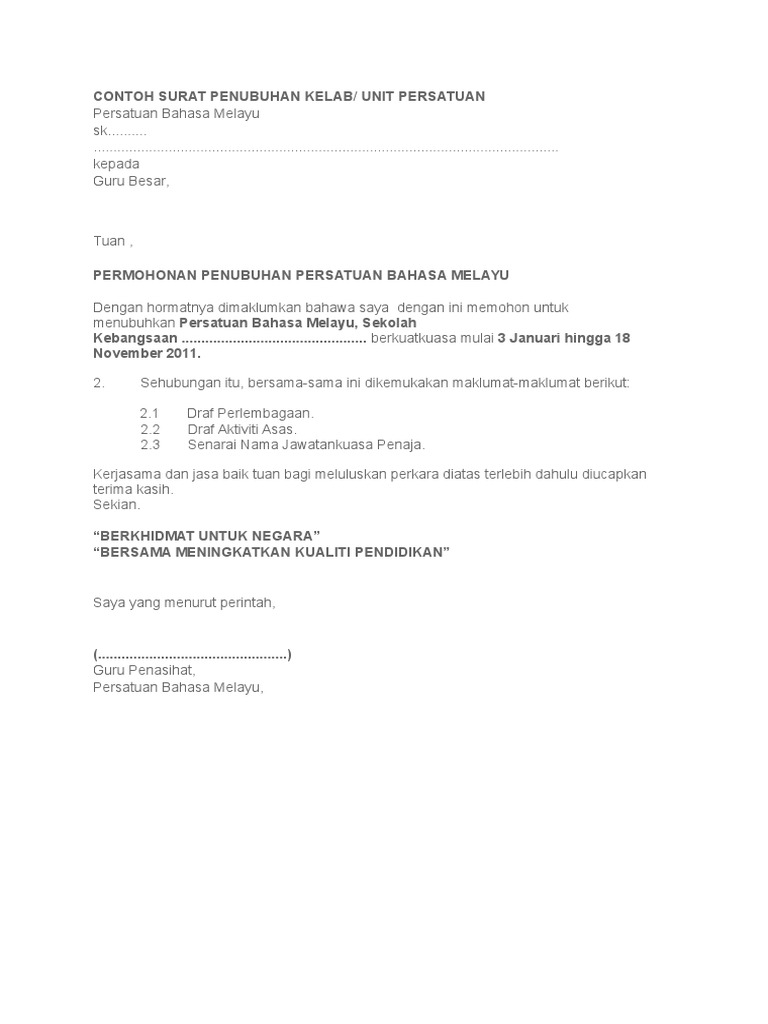 Contoh Surat Permohonan Penubuhan Kelab Dan Persatuan Bahasa Melayu Pdf